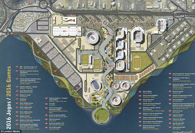 Los planos muestran el complejo que recibirá 15 deportes olímpicos y otros 11 paralímpicos para las primeras Olimpiadas realizadas en América del Sur; en el mapa se alcanza a ver el centro acuático (centro superior), los campos de hockey (al centro), el velódromo (campo azul al centro) y las canchas de tenis (a la derecha). Una de las prioridades de los creadores del proyecto es aprovechar cada rincón de las instalaciones en el futuro.