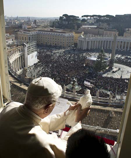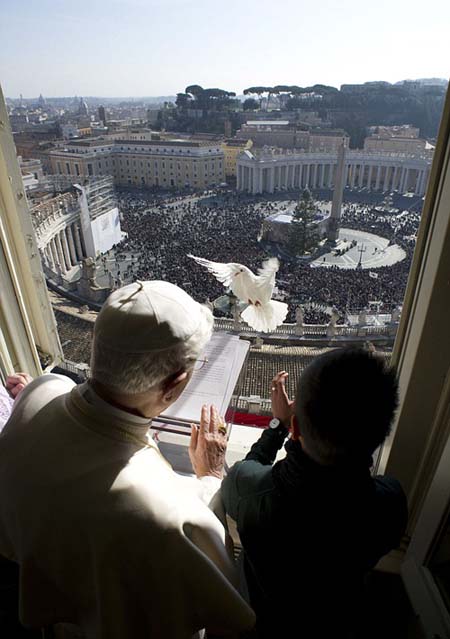 Como ya es toda una tradición en aquellas tierras, el último domingo de enero unos 2,000 jóvenes marcharon hasta la Plaza de San Pedro en la llamada “Caravana de la Paz” (Javier Sicilia, ya sabemos de dónde sacaste el nombre), para recordar a las víctimas del holocausto nazi. Ahí, el Papa dirige unas palabras y la oración del Ángelus. Al final libera unas palomas desde uno de los balcones como símbolo de paz.
