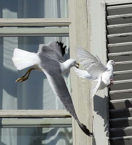 Una de las dos palomas se quedó atorada entre los antiguos pórticos y pilares del edificio. Entonces, una Gaviota que sospechamos, fue enviada por el mismísimo Patas de Cabra, atacó a la pobre palomita y le dio la perseguida de su vida ante la mirada atónita de los miles de fieles que se habían congregado en la plaza.